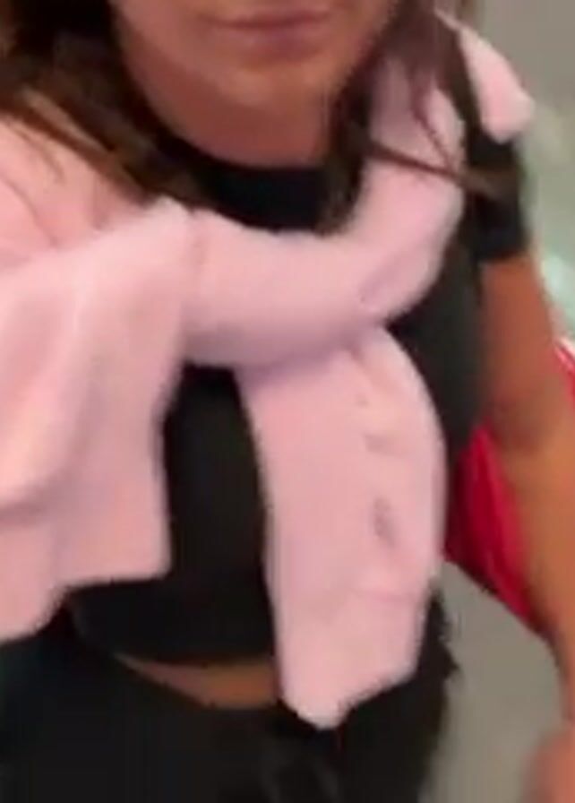 A woman walks in a busy airport terminal. She wears a black crop top, black sweatpants, and white sneakers, and has a pink sweater draped over her shoulders. She carries a red bag on her right shoulder. The floor is a light gray, and other people can be seen walking in the background. The woman appears to be recording herself with her phone.