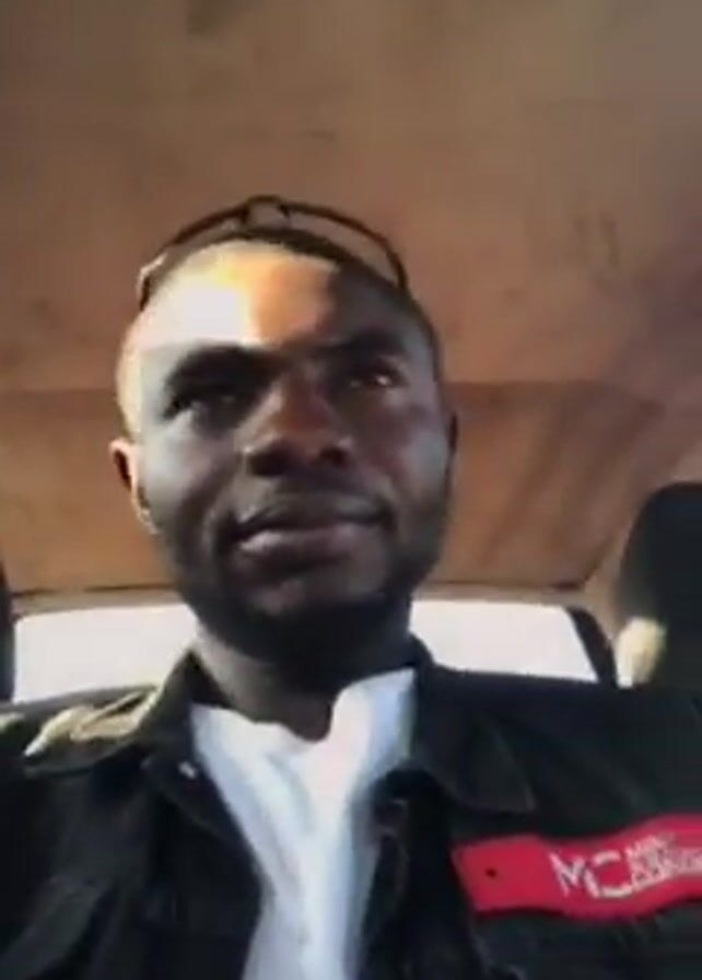man sitting in a car. He's wearing a black jacket over a white shirt. He's looking directly at the camera and speaking. He puts on sunglasses. The interior of the car is visible in the background, including the ceiling and headrest.