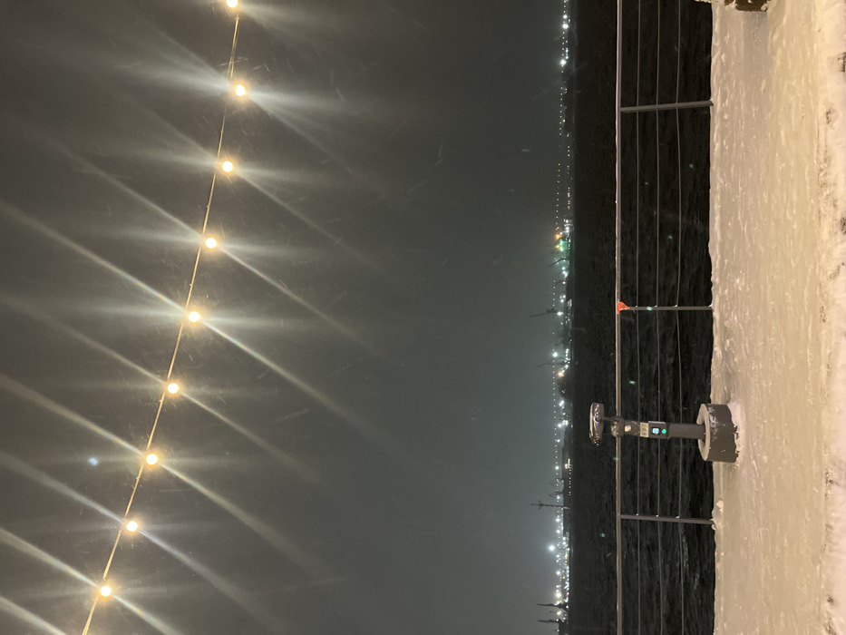A nighttime scene from a balcony or deck is depicted. A string of lights illuminates the left side of the view, while in the distance, city lights stretch along the horizon. A safety railing, covered with what appears to be ice or frost, stands to the right. The dark water below the railing contrasts with the illuminated cityscape. Snowflakes or particles appear to be falling or present in the air.