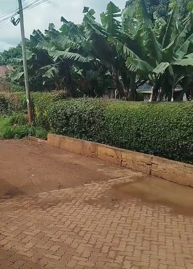 A static, eye-level shot shows a residential street scene. The foreground features a pavement of reddish-brown herringbone brick, partially wet with standing water. In the midground, a low, tan concrete barrier separates the pavement from a dense, well-maintained green hedge. Behind the hedge are various buildings, including houses with red roofs and white walls. Trees, including banana trees and other leafy varieties, are interspersed among the buildings, filling the background. A water tank on a metal frame is also visible. Utility poles with wires extend across the sky. The sky is partly cloudy, with blue patches visible. There are no people or animals visible in the frame.