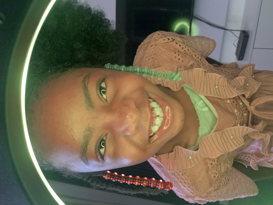 A young girl is depicted in a close-up, eye-level portrait within an indoor setting in Jos, Nigeria. She has dark skin and her dark hair is styled with braids adorned with red beads on the viewer's left and green beads on the viewer's right. She is smiling broadly, revealing her upper and lower teeth, which exhibit clear orthodontic retainers or aligners and a small diastema between the two front upper incisors. Her eyes, which contain prominent green arc reflections from a ring light, are directed towards the camera. She wears a peach or light pink top with ruffles and small pearl-like embellishments, layered over a lighter colored undershirt. Over the top, she has a peach or light pink open-knit cardigan. The upper portion of a green-illuminated ring light is visible above her head, serving as the primary light source. The background is dark and out of focus, showing a dark rectangular object, possibly a television screen, with a green crescent reflection on the right, and a smaller dark rectangular electronic device resting on a light-colored surface below it.