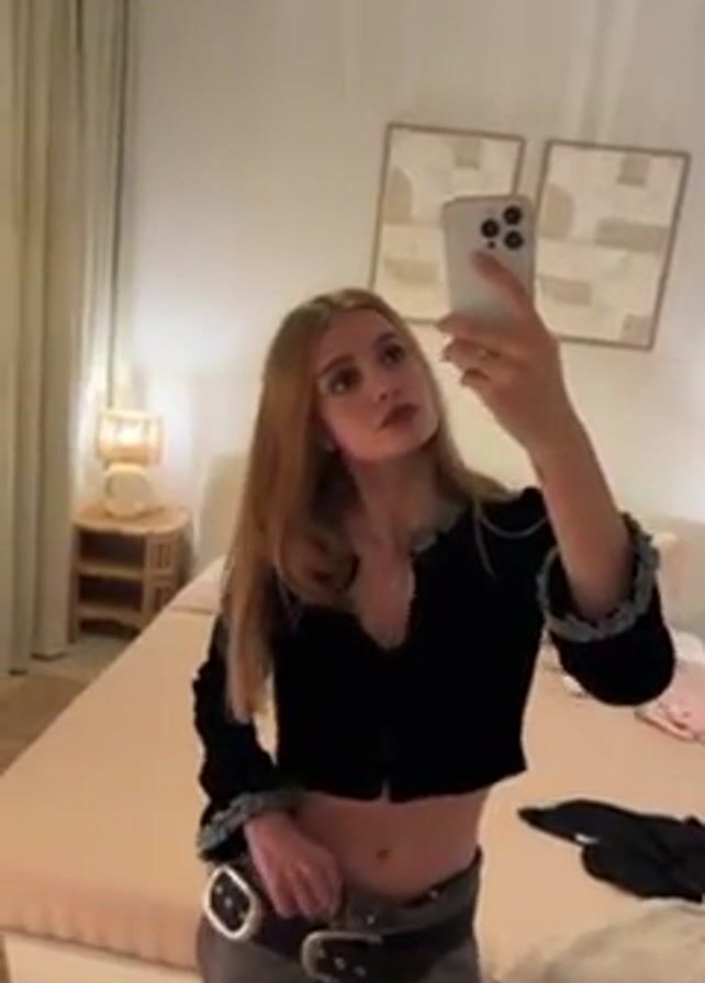 A woman with blonde hair is taking a selfie in a mirror. She is wearing a black crop top with grey trim, grey pants, and a black belt with silver buckles. She has a ring on her finger and a necklace. The background shows a bedroom with a bed, a bedside table with a lamp, and two framed pieces of art on the wall.