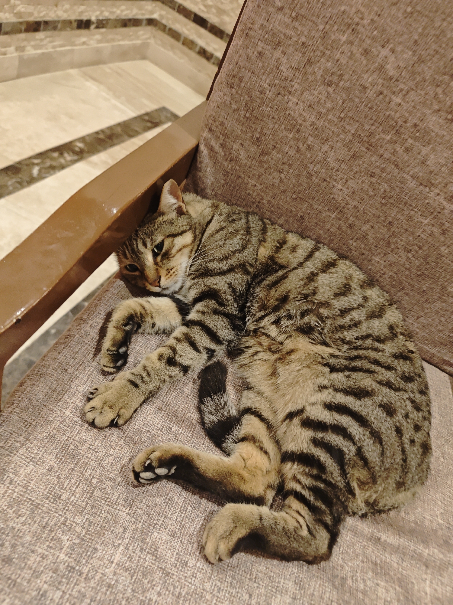 A domestic tabby cat rests on a brown upholstered chair. The chair has a brown wooden armrest. The background shows a tiled floor and wall. The location is Hurghada, Egypt.