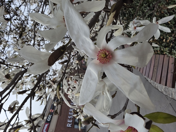 - "The image displays a close-up of a white-flowered magnolia tree in full bloom, with an urban commercial environment visible in the blurred background" by FM-HVR9v2, licensed under CC BY 4.0