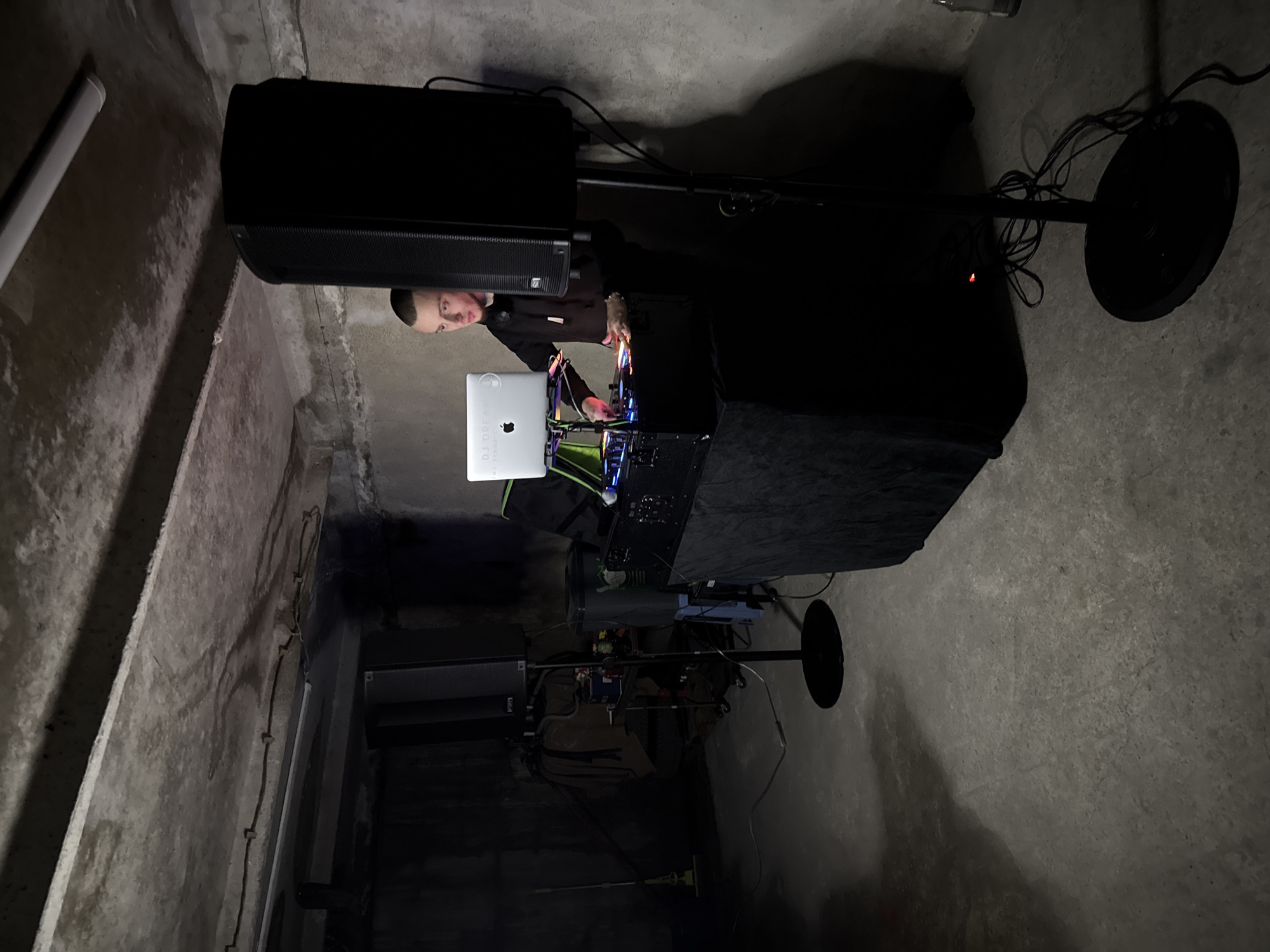 The image depicts a person operating DJ equipment in a dimly lit, unfinished basement