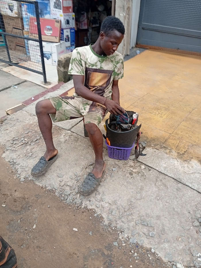 A young adult male, of dark complexion with short dark hair, is seated outdoors on an uneven concrete surface in Fegge, Nigeria