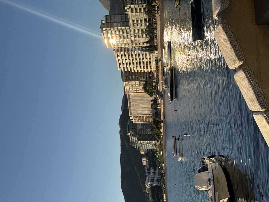 The image depicts a sunlit coastal scene in Budva, Montenegro, at what appears to be late afternoon. A clear, light blue sky with a faint contrail in the upper right quadrant serves as the backdrop to a bay, featuring numerous moored boats. In the immediate foreground, to the lower right, a concrete structure with tiered, upholstered seating or steps, patterned with a geometric design in white and grey, partially frames the view. The calm bay waters show prominent sun reflections, creating a shimmering path extending from the upper right toward the lower center. Multiple boats are visible: in the lower left, a white motorboat with a partial canopy and registration "BD 101" is moored. Further back, a larger white and dark-hulled motor yacht is situated centrally. Two smaller, light-colored dinghies, one with an outboard motor, are also present, along with a dark-hulled small boat closer to the sun's reflection. Several red and blue buoys are scattered across the water. Along the curved coastline, a sandy or pebble beach transitions into a developed urban area. A continuous line of multi-story buildings, primarily modern hotels or apartment complexes, dominates the mid-ground. One prominent building on the far right intensely reflects the sun from its glass facade, causing a distinct lens flare effect. Another large building to the left of center appears to be under construction or renovation, partially shrouded in white scaffolding netting. Palm trees are visible along the beachfront promenade. Behind the urban development, verdant, tree-covered mountains rise under the clear sky. Several indistinct figures are discernible on the distant beach.