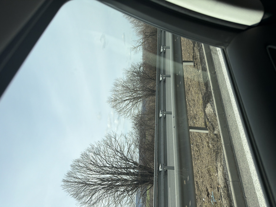 The image depicts a roadside view from within a vehicle, observed through a window