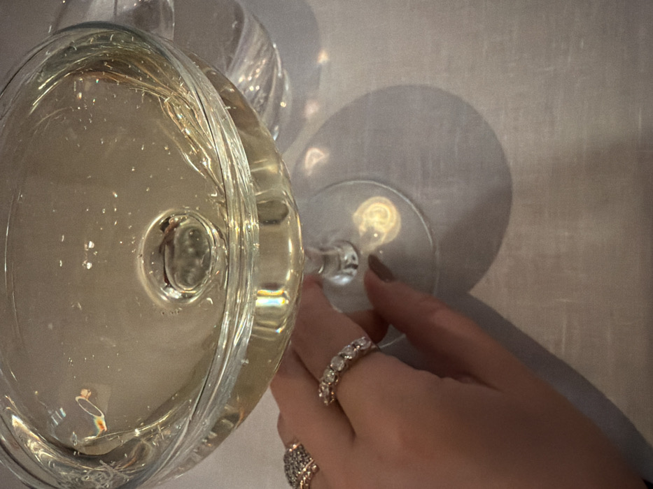 A top-down view shows a glass of white wine, casting a circular shadow on a light surface. A hand, adorned with two diamond rings, holds the stem. The focus is sharpest on the liquid within the glass, revealing slight distortions and reflections. The angle emphasizes the cylindrical shape of the wine glass bowl and its thick rim.