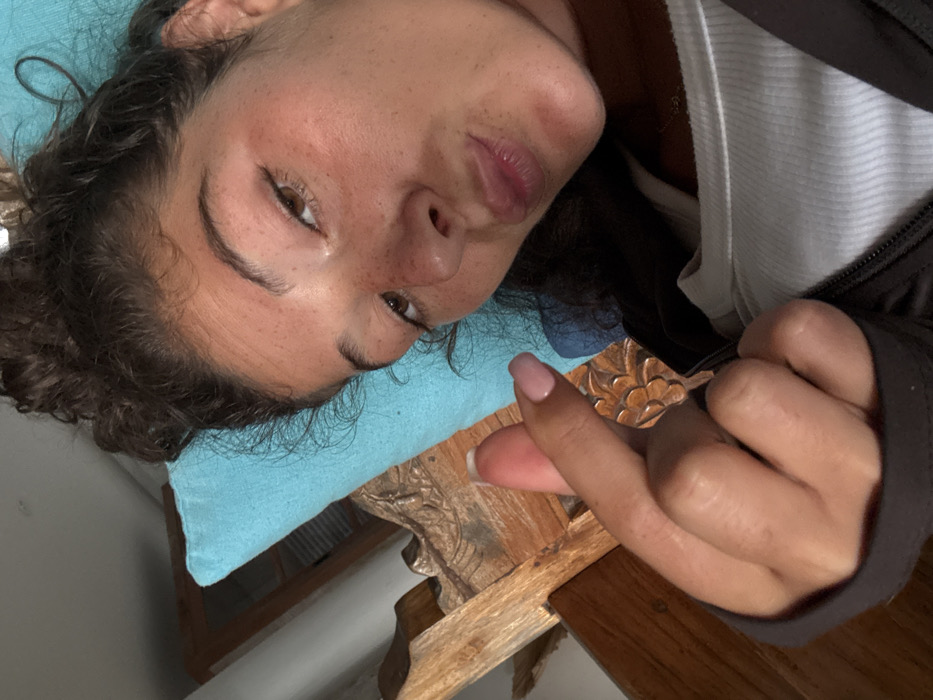 An angled, close-up indoor image captured in Pecatu, Indonesia, features a female subject with dark, curly hair pulled into a bun. Her tanned face exhibits freckles across the nose and cheeks, and her brown eyes are directed towards the camera. Her lips are slightly pursed. She is wearing a white ribbed tank top under a dark, zippered outer garment, with a thin necklace visible. Her right hand is raised, performing a "finger heart" gesture with pink-polished nails. The subject's head rests on a bright blue pillow. To the left, a piece of carved wooden furniture, possibly a headboard, is visible, and in the distant background, a window frame with horizontal blinds is partially discernible against a light-colored wall.