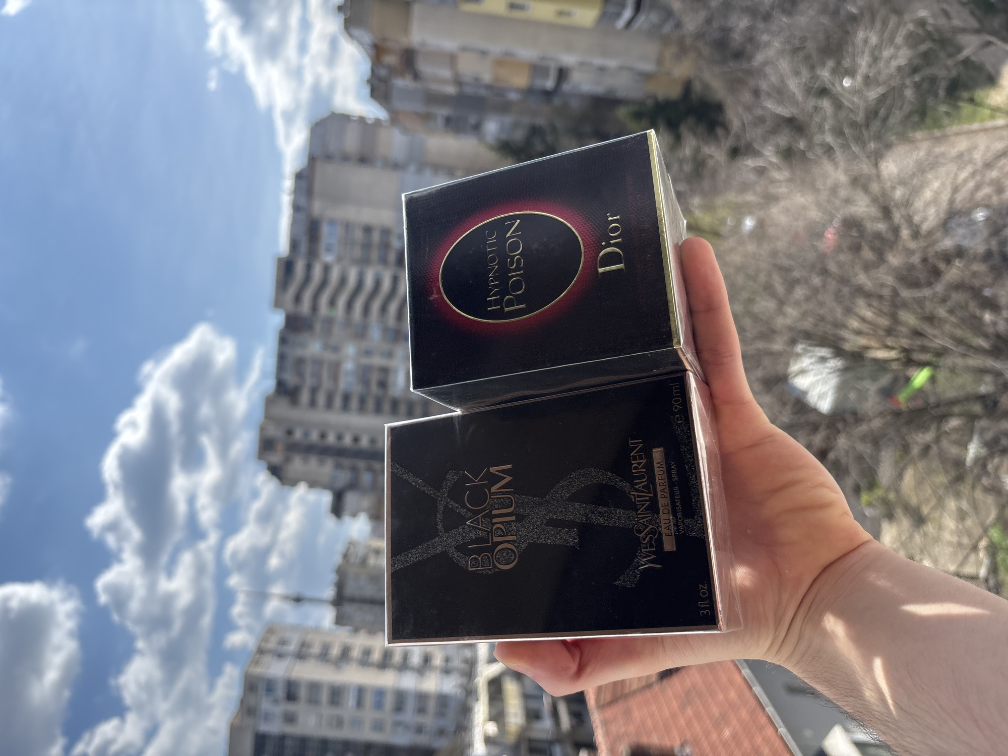 The image depicts a close-up, outdoor daytime scene featuring a human hand holding two packaged perfume boxes against an urban backdrop. A light-skinned right hand, with visible hair on the forearm and fingers, is holding the two perfume boxes forward. The box on the left is black with gold-colored, glitter-effect text and branding, clearly visible as "YVES SAINT LAURENT BLACK OPIUM EAU DE PARFUM e 90 ml 3 fl. oz.". The box on the right is dark, possibly black or deep red, with an oval design featuring red and gold text, identified as "Dior HYPNOTIC POISON". Both boxes appear to be sealed in clear plastic. The background is out of focus but reveals essential environmental details. Above the urban structures, a bright blue sky is partially covered by scattered white cumulus clouds. The mid-ground and distant background are filled with numerous multi-story residential apartment buildings, characteristic of post-socialist architecture, with light-colored facades and visible balconies and windows. A prominent, slender communication tower, specifically identified as the Ruse Television Tower, is visible in the distant background, slightly to the left of the image's center, confirming the location as Ruse, Bulgaria. Below the line of the distant buildings, bare tree branches, indicative of late winter or early spring, and a segment of a reddish-brown tiled roof are visible in the lower-left foreground. Strong natural sunlight illuminates the scene, casting shadows, notably on the forearm.