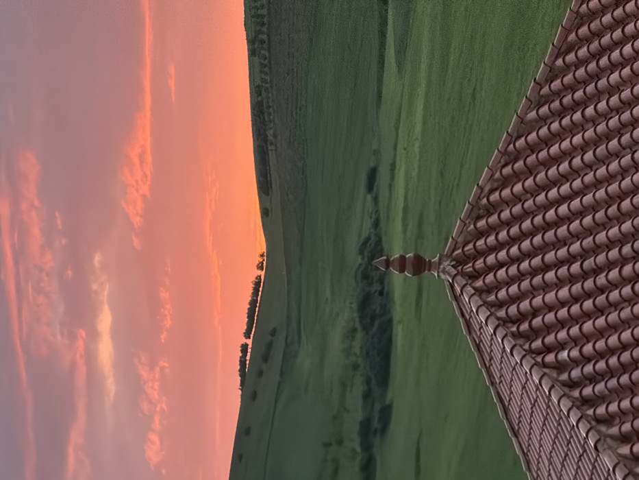 The image depicts a rural landscape at sunset in Dkhissa, Morocco. The sky occupies the upper two-thirds of the frame, showcasing a vivid gradient from intense orange at the horizon line to lighter pink and red hues higher up, with scattered, horizontally elongated clouds. Below the sky, a series of undulating green hills extends across the midground and background. These hills are covered with lush vegetation. A distinct line of trees, appearing as dark silhouettes, is visible along the crest of the left-most hill. Further to the right, another section of hills features organized rows of smaller trees. The foreground is dominated by a reddish-brown tiled roof, viewed from an elevated perspective. The ceramic tiles are uniformly arranged in parallel rows. A decorative, multi-tiered reddish-brown finial caps the peak of the visible roof structure. No people or animals are present in the scene.