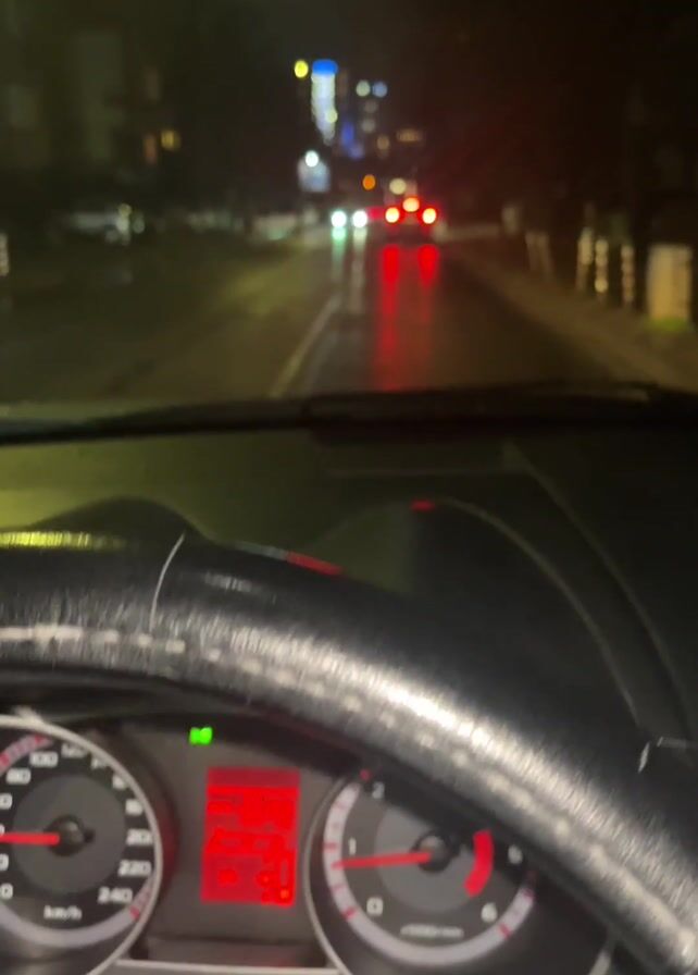 car interior at night. The dashboard is visible, including the speedometer and tachometer. The steering wheel is in focus and has a carbon fiber pattern. Through the windshield, the road ahead is seen, illuminated by streetlights and the headlights of other cars. The road appears wet, possibly from rain. The video appears to be taken from the driver's seat. Metal music is playing.