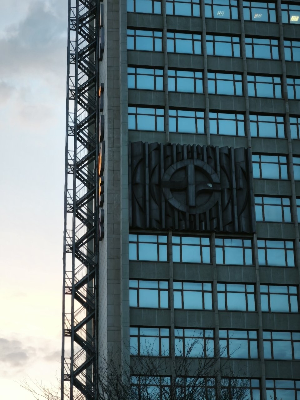 The image depicts a section of the National Palace of Culture (NDK) building in Sofia, Bulgaria. The central subject is a multi-story, concrete-faced structure characterized by a regular grid of rectangular windows with a prominent blue tint, reflecting the sky or internal lighting. Along the left edge of the visible facade, a dark grey, external metal fire escape or emergency staircase with multiple landings and railings extends vertically from the bottom of the frame towards the top. On the building's main facade, positioned approximately mid-height, a large, dark, circular relief sculpture featuring abstract geometric patterns is affixed. Some interior lights are visible through a few windows on the upper right section of the building. The sky to the left of the building is overcast with lighter hues towards the horizon. Bare tree branches are partially visible in the bottom foreground, extending upwards against the building's base. No individuals are present.