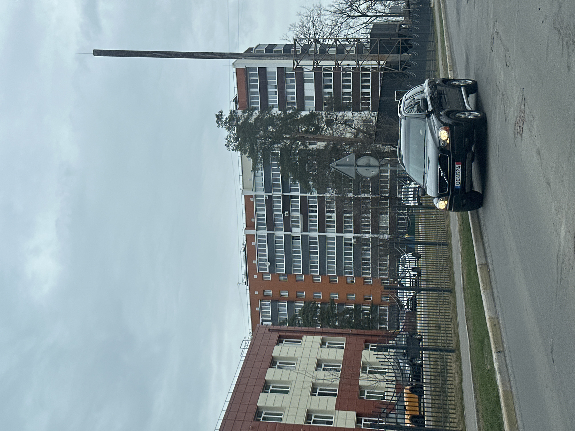 This image depicts a street scene in Irpin, Ukraine, under an overcast sky. In the foreground, an asphalt road with visible potholes runs from the lower-left to the center. A curb separates the road from a narrow strip of grass, behind which a dark metal fence with vertical bars extends across the midground. A black Volvo XC90 SUV, bearing Ukrainian license plate "OC4524," is positioned on the right side of the road, facing slightly left. Its headlights are illuminated. Behind the fence, several parked vehicles are discernible, including a yellow/orange SUV on the left and a white car further right. Partially obscured by the fence and trees are two street signs, one circular and one triangular, mounted on a pole. In the mid-to-background, two multi-story buildings dominate the horizon. To the left, a building with cream/beige and reddish-brown facade panels features numerous rectangular windows. To its right, a taller, multi-block residential apartment building with orange, white, and dark grey sections displays multiple windows and balconies. Several trees, including a prominent pine tree, stand between the buildings and behind the fence. To the far right, a tall, slender, dark industrial chimney or stack rises vertically, with visible scaffolding at its base. No individuals are present in the scene.
