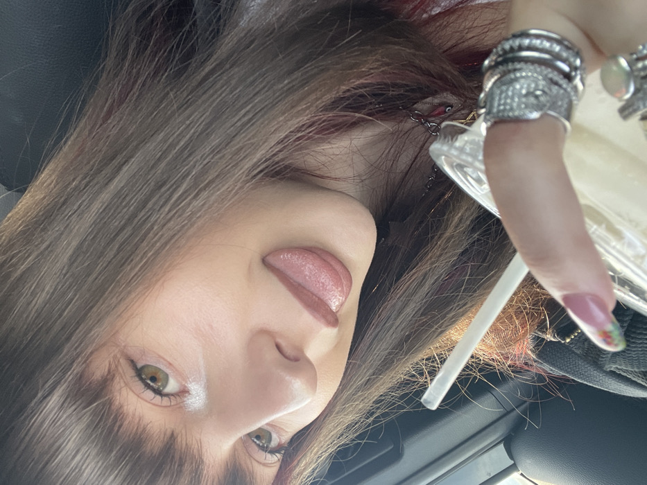 A close-up selfie captures a fair-skinned individual with straight, dark brown hair and bangs. Her visible left eye has a green iris and a defined eyeliner. Her mouth is slightly open, with her tongue partially extended. She is wearing light-colored lipstick. Her left hand is prominent, holding a clear plastic cup containing a light-colored liquid and a white straw. Multiple silver-toned rings adorn her left hand, including a large, multi-banded ring on her ring finger. Her fingernails are manicured with a pink French tip style and a colorful design on one nail. A faint necklace with a small, dark pendant is visible around her neck. The background shows a dark, upholstered car interior, with a blurred window reflecting daylight, indicating the subject is inside a vehicle. The specific location within the city of Hadera, Israel, is not discernible from the visual information presented.