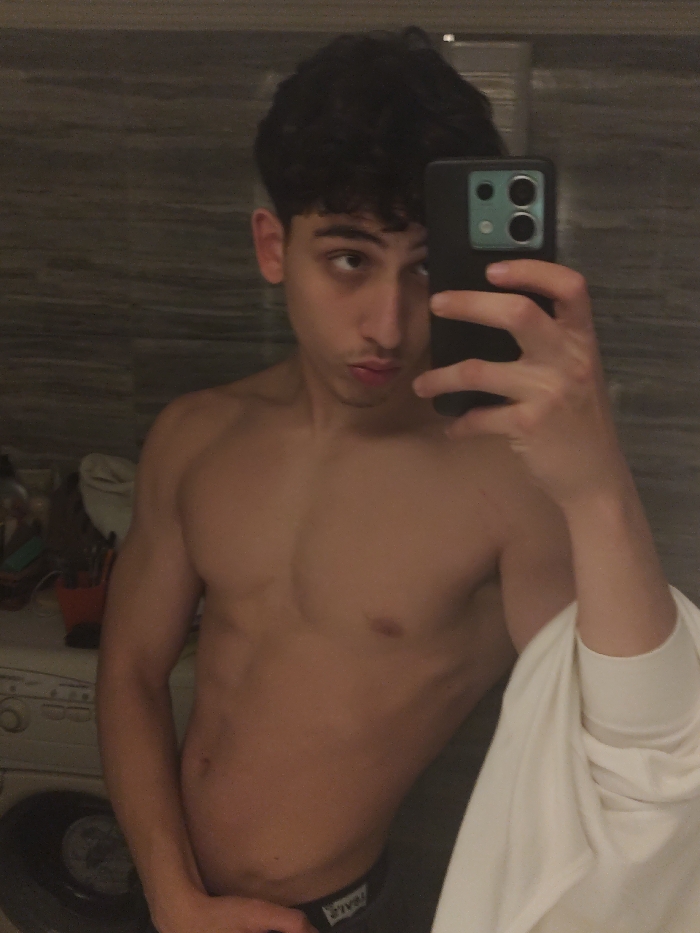 A shirtless young man takes a selfie in a bathroom. He has dark curly hair and is holding a smartphone with a multi-lens camera. His physique is visible, showing defined chest muscles. Part of a washing machine and toiletries are visible in the background. He has a white garment draped over one arm. The bathroom walls have a textured, gray-toned surface. The lighting in the room appears to be dim, and the overall image has a slightly grainy quality.