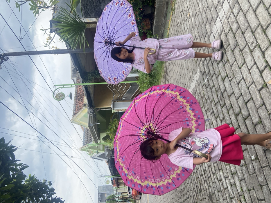 Two young girls stand on a brick path holding open umbrellas. The foreground umbrella is pink with a yellow flower border, shielding a girl wearing a pink skirt and t-shirt. Behind her, another girl holds a lavender umbrella with a similar flower border. She's wearing matching pajamas and slippers. Buildings and greenery line the street. Overhead, wires run through the sky.