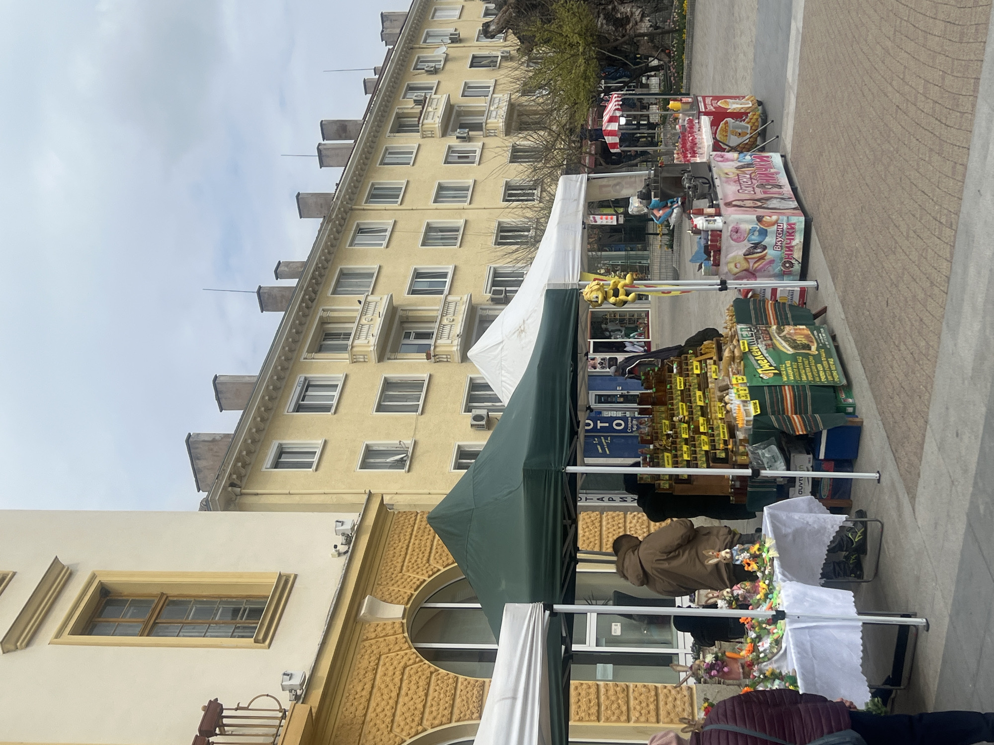 street market scene in Sliven, Bulgaria. Several vendor stalls are set up along a sidewalk paved with light brown concrete. A tall, light yellow building with multiple windows and balconies forms the backdrop. In front of it, a stall with a dark green awning sells various products, including small bottles of liquids. Adjacent to this stall is another with white cloths and colorful flowers on display. Further down the sidewalk, another stall features a red and white striped umbrella and offers food items like donuts and other snacks. People are present at the stalls, likely shopping or browsing the merchandise. The sky is overcast.