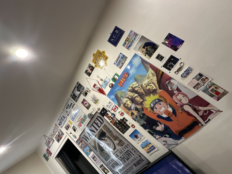 The scene depicts a brightly lit interior wall located in Chantilly, France. The wall, painted white, is extensively decorated with a dense collection of personal memorabilia. In the upper-left quadrant, a dark window or door frame with closed blinds is visible. An overhead artificial light source, located in the upper-middle portion of the image, produces a strong glare. Two prominent posters are affixed to the wall: a large "WANTED" poster for "MONKEY D. LUFFY" from *One Piece*, indicating a bounty of "500,000,000 BERRY", and a large *Naruto* anime poster featuring central characters including Naruto Uzumaki, Sasuke Uchiha, and Sakura Haruno, with other characters in the background. Various decorative license plates are mounted, bearing names such as "BIARRITZ", "MONTREAL", "NEW YORK", "LOS ANGELES", and "MIAMI", alongside a black plate with a stylized crest. The wall also displays numerous smaller items, including postcards depicting landscapes and cityscapes (e.g., "LES ALPES"), and several photographs, some framed, showing groups of individuals. Other notable objects include a yellow hexagonal sign with "DEFFONCE PRU FUMER 100" in French text, a blue rectangular sign marked "S.C.B.", a red and white pennant flag, a green and white flag, and small trinkets such as a skateboard keychain, a miniature handbag keychain, and an 'evil eye' charm. A small image of cherries and a red cross symbol are also present. No active subjects are depicted within the immediate scene; all individuals are represented in static images on posters or photographs.