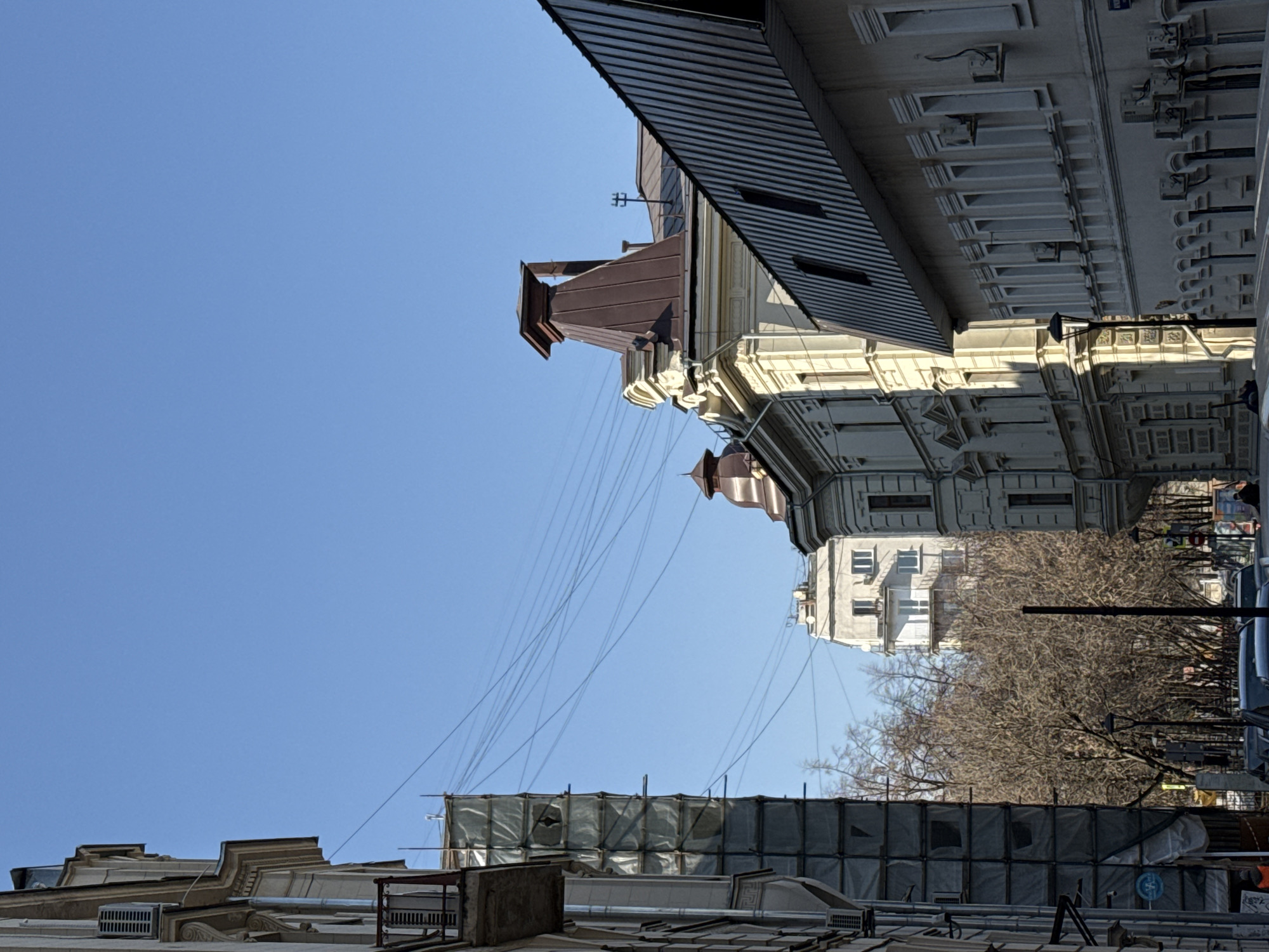 An upward-angled view captures an urban street scene in Naro-Fominsk, Russia, under a clear blue sky. On the far left, a light-colored multi-story building facade is partially visible, featuring decorative architectural elements and an exterior air conditioning unit. Below it, a black metal balcony railing is present. Adjacent to this building, a tall scaffolding structure, enveloped in light-colored, square-patterned tarps, stands partially obscured, with several tears or openings in its covering. A blue circular sign with a white symbol is attached to the lower section of the scaffolding. Numerous thin, dark utility lines traverse diagonally across the clear sky, originating from near the top of the scaffolding and extending towards the right. In the mid-ground, a dense cluster of leafless deciduous trees occupies the space between buildings. Behind these trees, a tall, light-colored residential building with multiple windows and balconies is visible. In front of the trees, at street level, dark-colored parked vehicles are present. A black, ornate streetlamp stands on the sidewalk. A person in an orange-colored top is partially visible behind a parked car on the far left. To the right, a multi-story, light-colored building features a distinctive brown pyramidal roof structure (cupola) atop a corner, with visible architectural detailing such as cornices and decorative moldings. To its immediate right, another building with a dark, ridged metal sloped roof, incorporating multiple dormer windows, extends along the right edge of the frame. The facade of this building displays a series of recessed rectangular window frames, with multiple exterior air conditioning units mounted below them at varying levels. Sunlight illuminates parts of the buildings from the left.