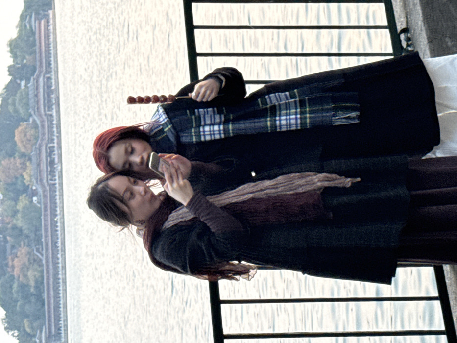 The scene depicts two East Asian females, appearing to be young adults, standing beside a body of water, separated by a black metal railing and a light-colored concrete ledge. The location is specified as Xicheng District, China, with a large lake and a distant traditional Chinese architectural complex with red roofs and multiple pavilions on the far bank, backed by hills featuring autumn-colored foliage. The subject on the left has long dark hair and is wearing a dark, long-sleeved garment, possibly a dress or tunic, over a textured undershirt, complemented by a multi-layered scarf in shades of maroon and beige. She holds a light-colored smartphone horizontally with both hands, her thumbs poised as if interacting with the screen, her gaze fixed on the device. The subject on the right has shoulder-length red hair and wears a dark long coat over white trousers, with a blue, green, and white plaid scarf around her neck. She leans slightly towards the left subject, looking at the smartphone. In her right hand, she holds a wooden skewer containing approximately seven red, candied fruits, resembling tanghulu. Both subjects appear focused on the smartphone held by the left subject. The water in the background is calm, and the sky is a pale, possibly overcast, grey.