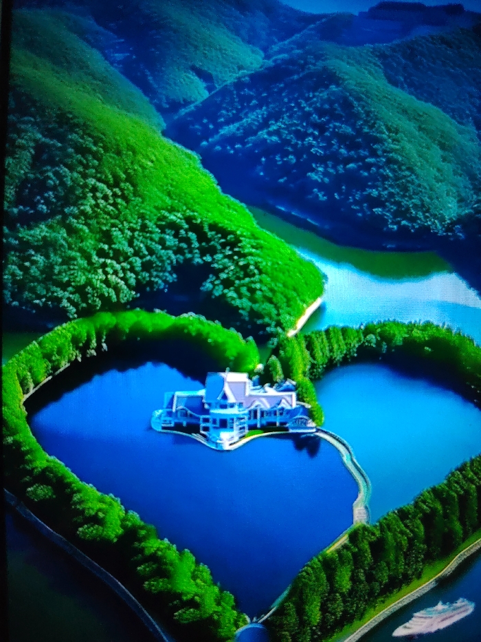 This image presents an aerial view of a landscape in the vicinity of Rozino, Bulgaria. The primary feature is a heart-shaped body of intensely blue water, meticulously outlined by a dense growth of vibrant green trees. Within the left lobe of this heart-shaped water formation, a multi-story white house with a distinctive blue roof is situated on a light-colored, artificial island. A slender, light-colored walkway extends from the house's island, curving over the water to connect with the landmass forming the right lobe of the heart. Beyond this central heart-shaped area, the terrain consists of numerous steep, rolling hills heavily covered in uniform green foliage, descending into a broader, winding river or reservoir of deep blue water. In the lower right quadrant, a white vessel, possibly a yacht or small cruise ship, is partially visible on the larger water body. No individuals or discernible activities are depicted.