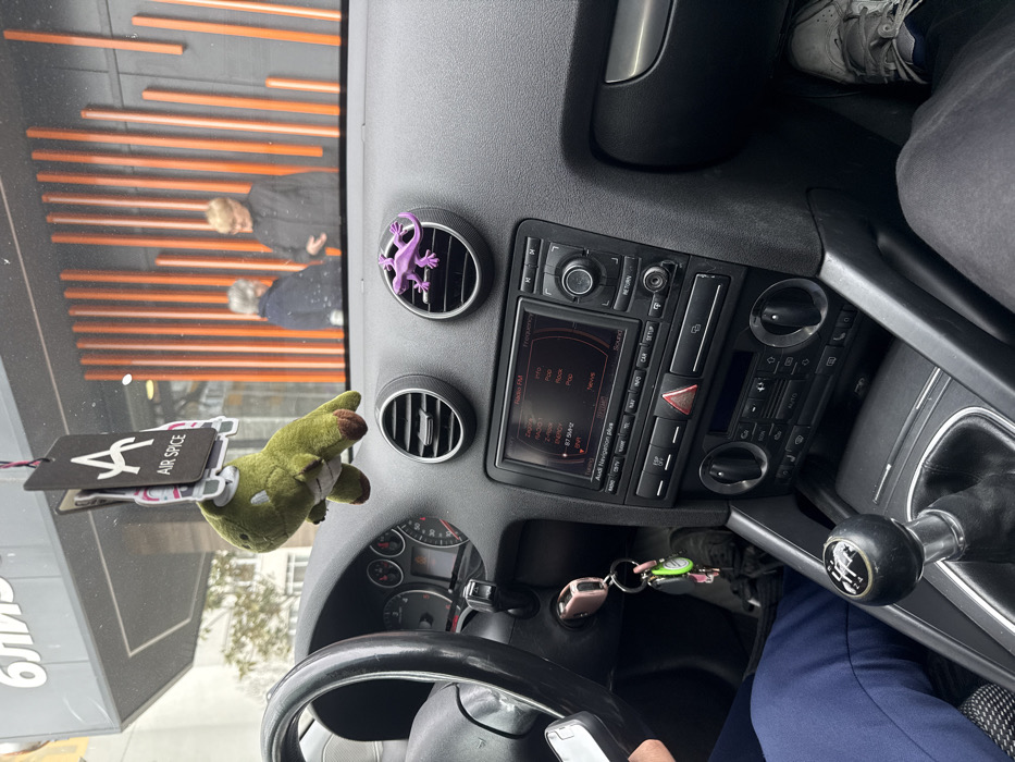 The image depicts the interior of a vehicle, an Audi, from a passenger's perspective, looking forward through the windshield onto a street scene in Stara Zagora, Bulgaria. Inside the vehicle, the dashboard is visible, featuring a multi-function steering wheel on the left, an infotainment system displaying "Radio FM" with station options (e.g., Z-Rock, Energy, VOYCE, B7 87.8MHz, News), and climate controls below. A black manual gear shifter is positioned in the center console. A key ring with multiple keys and a pink fob hangs from the ignition barrel. Two circular air vents are present, with a purple gecko-shaped clip attached to the rightmost vent. A small green plush toy, resembling a dinosaur or dragon, and a black "AIR SPICE" air freshener hang from the rearview mirror. A person's left hand, holding a smartphone, is partially visible on the driver's side, wearing blue trousers. On the front passenger side, legs wearing dark trousers and a white sneaker are visible. Outside the vehicle, reflected through the windshield, two elderly individuals are seen standing on a sidewalk in front of a building. The building facade features numerous vertical orange panels of varying lengths. A partial white sign with Cyrillic text, reading "БЛИЗ" (BLIZ), is visible above the building. The person on the left has grey hair and wears a dark jacket. The person on the right has blonde hair, wears a dark jacket, and appears to be interacting with the person on the left. The sky appears overcast.