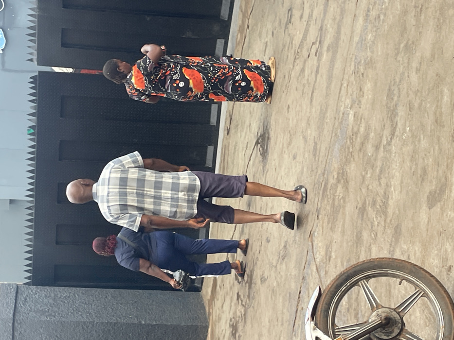 Three people stand on a concrete surface near a black metal gate and a motorcycle. One person, wearing a patterned dress with orange fish, is positioned farther from the camera. In front of her is a man in a blue and white plaid shirt and dark shorts. In front of him and to the left is a woman in a dark blue tracksuit. The front wheel of a motorcycle is visible on the right.