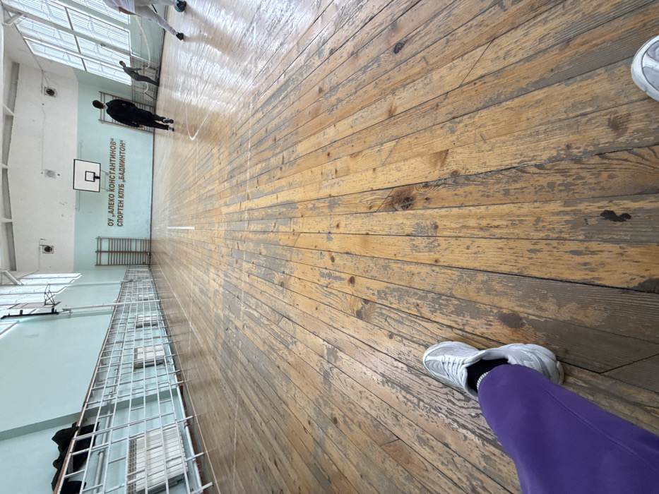 The image captures the interior of a gymnasium, specifically identified by Cyrillic text on the far wall as "ОУ „АЛЕКО КОНСТАНТИНОВ“ СПОРТЕН КЛУБ „БАДМИНТОН“," placing the location at the Aleko Konstantinov Primary School and Badminton Sports Club in Dimitrovgrad, Bulgaria. The perspective is low, originating from a person whose left leg, clad in purple sweatpants and a light grey athletic shoe (Nike Air Max style), is prominently visible in the lower left foreground. The gymnasium floor is constructed from wide wooden planks, showing significant wear with widespread areas of stripped finish and exposed raw wood, alongside faded white court markings. The walls are two-toned, with a light blue-green lower section and a white upper section. The far wall features a mounted basketball hoop and backboard, along with a set of wooden wall bars. Along the left wall, a long, white metal barrier system is installed, behind which radiators are visible. The right wall contains large, multi-paned windows that extend high towards the ceiling. Three individuals are present in the background. One person, wearing dark clothing, is in motion near the center-right, with their back partially facing the viewer. To the right, another person in light clothing is bent over, interacting with a dark sports ball on the floor, positioned near their raised left foot. A third individual, also in dark attire, is partially obscured further right, near the windows. The scene conveys a moment of activity within the sports hall.