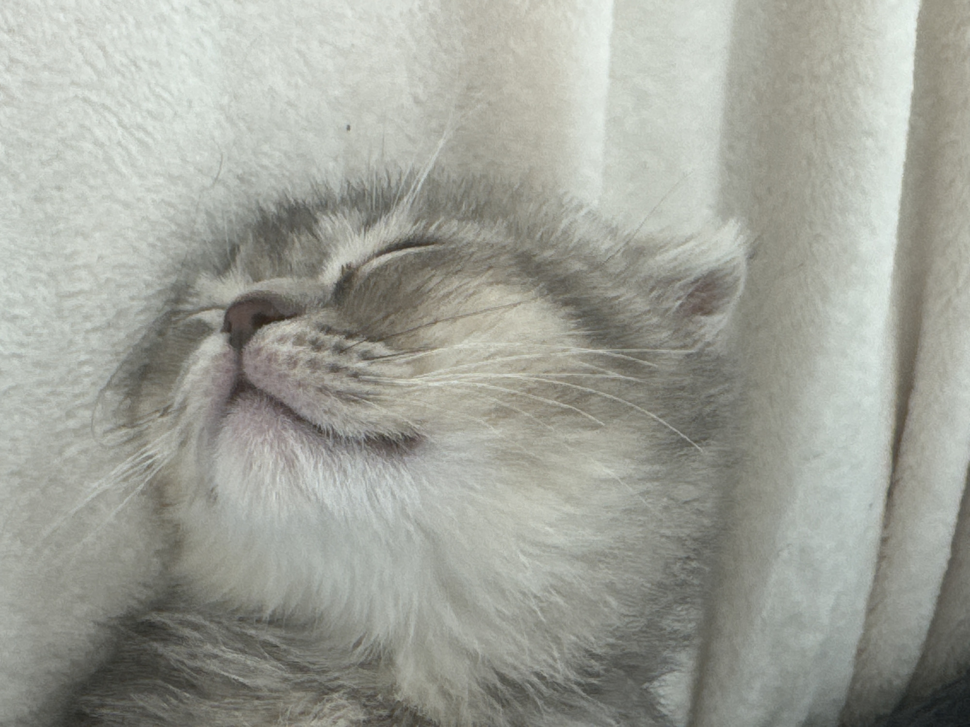 A light-colored feline kitten is observed sleeping on a textured, light-colored fabric surface in Strasbourg, France. The kitten's head, with its left side visible, occupies the central and right portions of the frame. Its eyes are closed. The muzzle area features a pink nose and partially visible mouth, with multiple white vibrissae extending outwards. The fur exhibits varied tones of light grey and white, indicating a fluffy texture. The underlying fabric, which appears as a cream or off-white color, displays soft folds and fills the entire background, rendered with shallow depth of field.