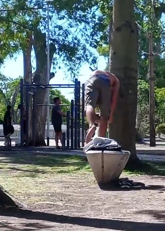 man shirtless and wearing shorts bending over a trash receptacle in a park on a sunny day. The receptacle is light gray in color and inverted cone-shaped. The man is facing away from the camera. Behind the man are several trees, a metal structure that appears to be exercise equipment, and another person standing near the structure. There are shoes lying on the ground next to the trash receptacle. The ground is dirt with grass. There are also trees on the left and right sides of the shot. The sky is blue with some clouds.