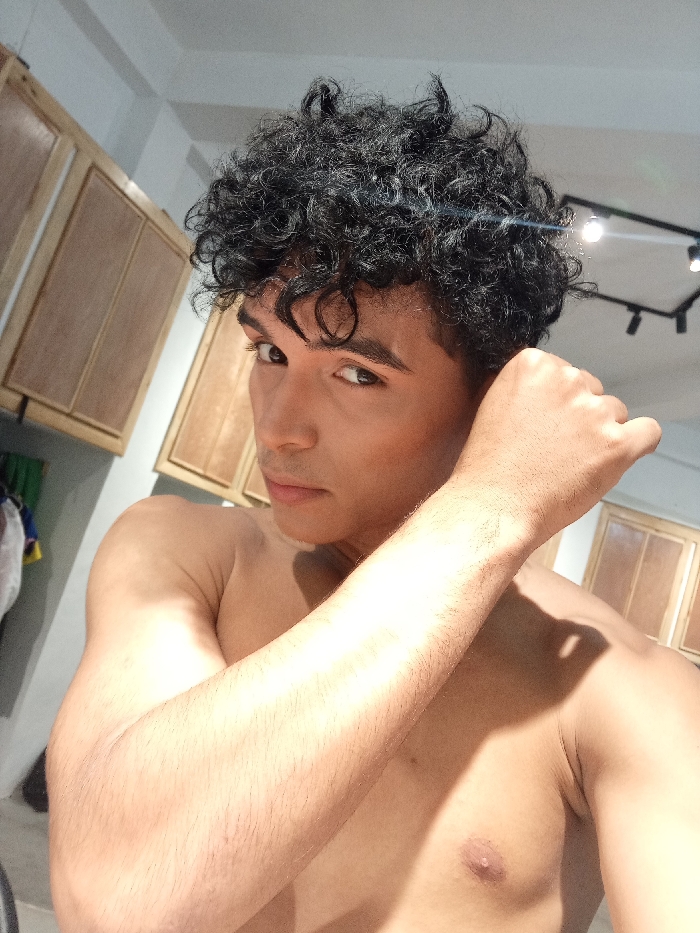 A shirtless, light-skinned man with dark, curly hair poses indoors. His right hand is raised near his face. The lighting highlights his features and physique. He is gazing into the camera with a serious expression. Behind him are light-colored cabinets and a modern track lighting fixture. The background suggests a bathroom or bedroom setting.