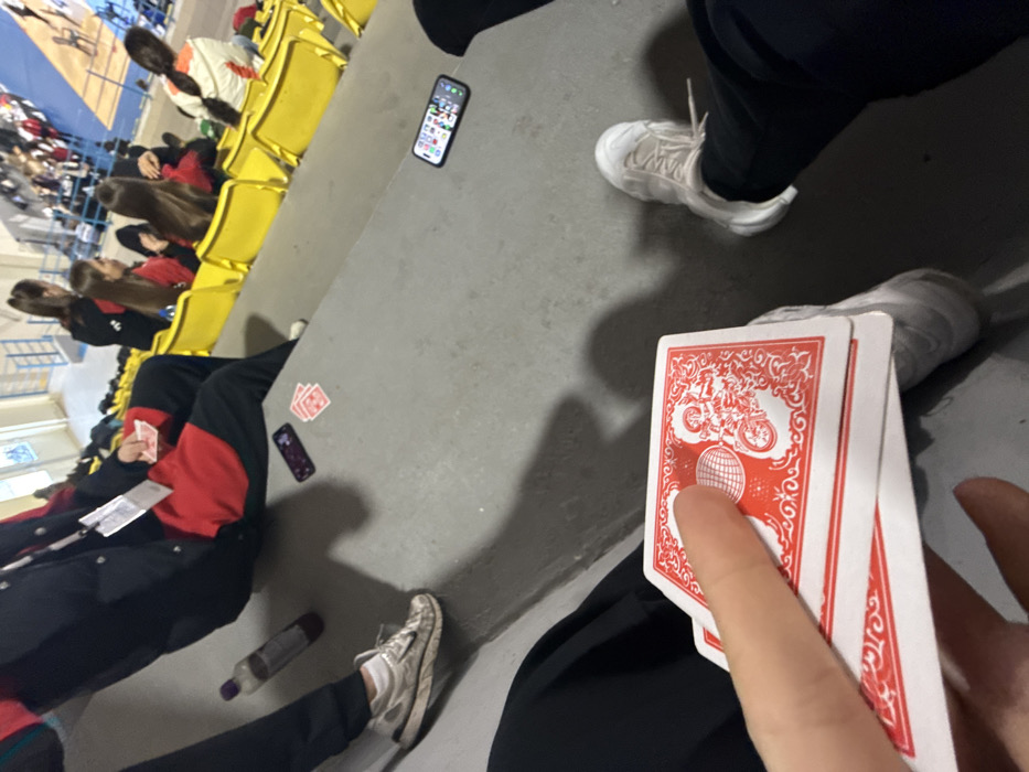 The image captures an interior view of a tiered seating area within an indoor sports arena in Blagoevgrad, Bulgaria. In the immediate foreground, a person's hand holds a fanned stack of playing cards, displaying red backs with a white design of a disco ball and motorcycle. The individual's leg, clad in black pants and a white sneaker, is partially visible. To the right, another person's leg in black pants and a white sneaker is also visible. On the concrete step directly in front, a black smartphone displaying multiple app icons lies face up. Further up the concrete tier, another individual is seated, wearing black pants and a black jacket with red accents, an identification badge hanging from their neck. Near their left foot, which wears a dirty white Nike sneaker, a purple plastic water bottle rests horizontally. Adjacent to the bottle, a second black smartphone with a purple case is positioned face up, alongside a small stack of identical red-backed playing cards. Shadows of individuals are cast across the concrete surface. The background reveals multiple rows of unoccupied and occupied yellow plastic arena seats. Several individuals are seated, many wearing black and red garments. Beyond the seating, a section of a sports court, featuring blue and light-colored flooring, is visible, suggesting an ongoing or recently concluded athletic event. Structural elements, including metal railings, are present.