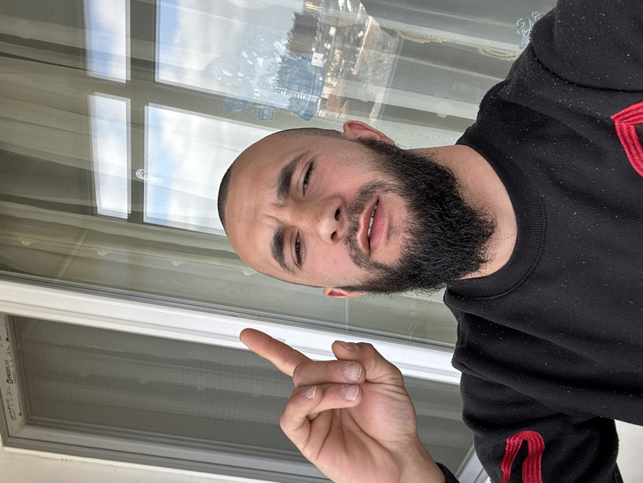 An adult male is captured in a selfie-style portrait, positioned indoors in front of a window system