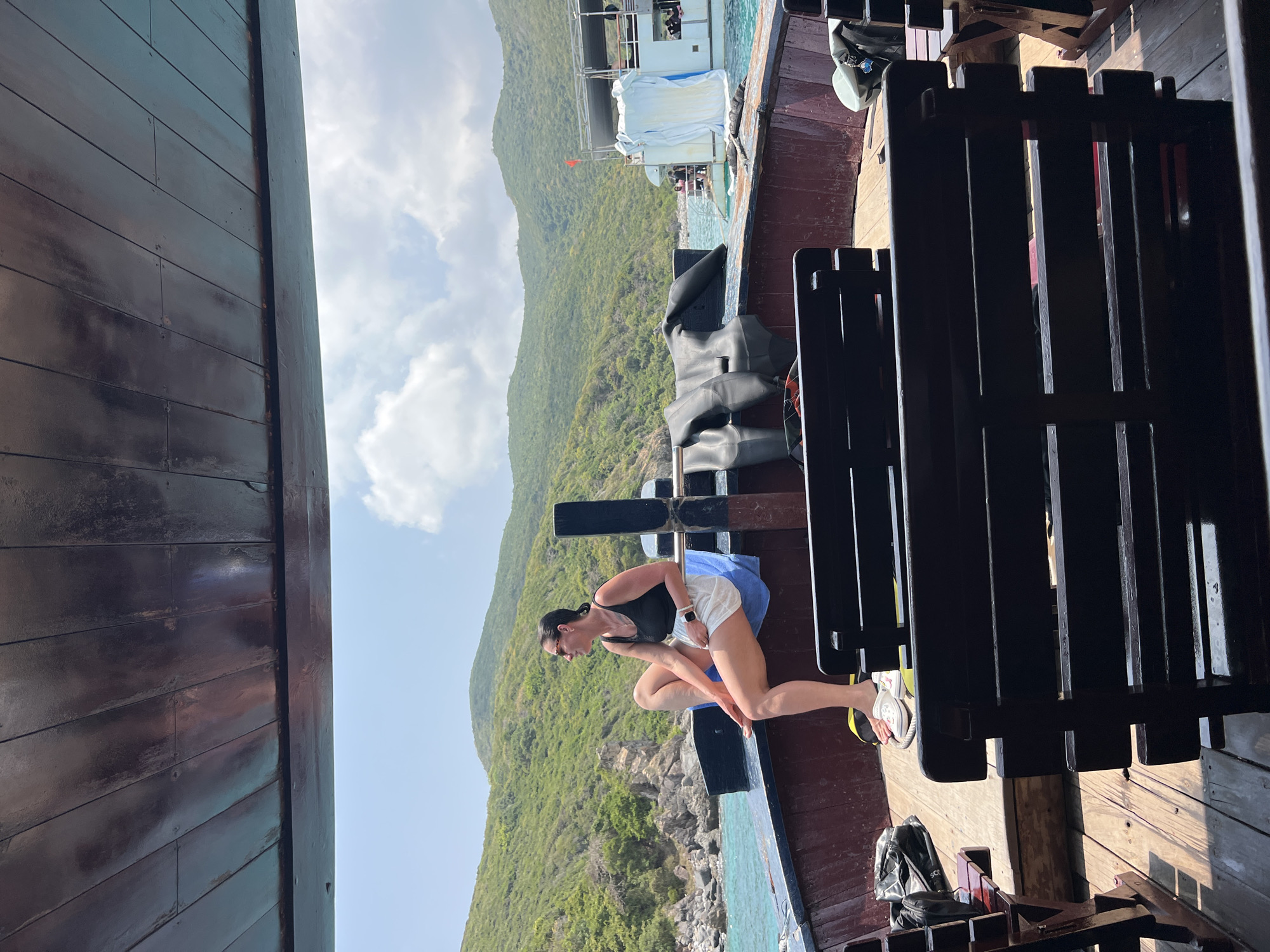 A woman is squatting on the edge of a boat, peering over the side. She is wearing a black top, white shorts, and sneakers. The boat is wooden and has wooden benches along the side. The background shows a green, mountainous coastline and a blue sky with clouds. The location is likely in the Natural Heritage Area Trang, Vietnam, judging by the landscape. Other passengers and diving gear can be seen on the boat.
