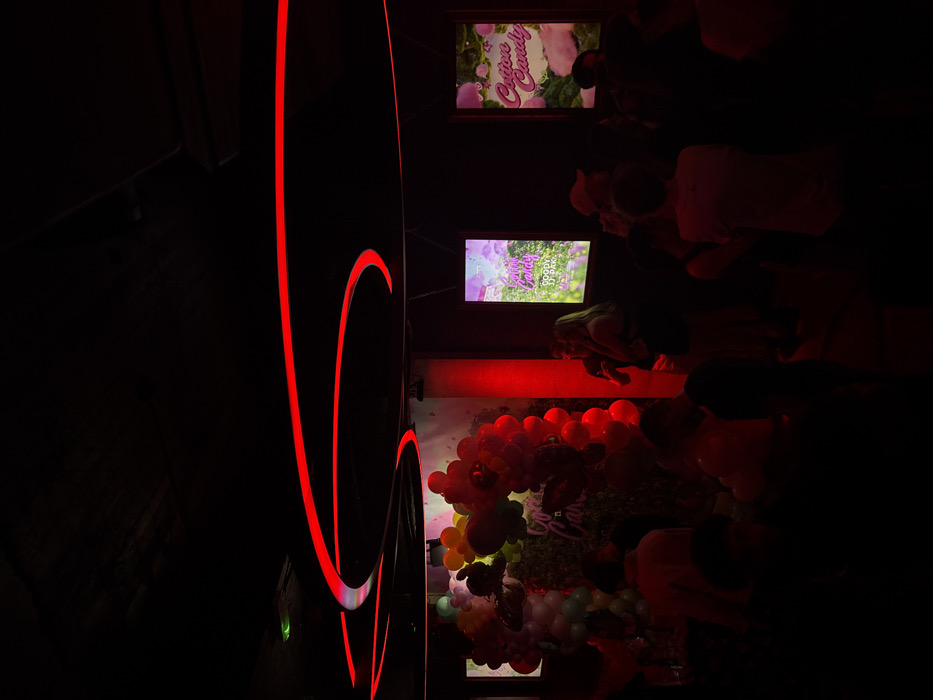 The image depicts an indoor event space, location in the city of Unknown, Unknown. The environment is dark, illuminated primarily by red lighting. The ceiling features multiple curved, illuminated red strip lights. On the left side of the frame, a large balloon arch or display is present, composed of balloons in various colors including light blue, green, yellow, orange, and red. Behind the balloons, a dark backdrop shows text, partially obscured, that appears to read "Cotton Candy." A red spotlight illuminates the wall segment to the immediate right of the balloon display. In the midground and background, approximately fifteen to twenty individuals are visible, mostly as silhouettes or dimly illuminated by the red light, indicating a gathering. On the right side of the frame, two vertical, illuminated digital screens or posters are mounted on a dark wall. Both displays feature the text "Cotton Candy" with stylized graphics; one also contains the text "Goody's Bar". A woman with long hair is positioned near the left screen, facing left, with her hand raised toward her mouth. Another individual wearing a light-colored baseball cap is discernible further right, near the second screen. Individuals are standing and appear to be socializing.