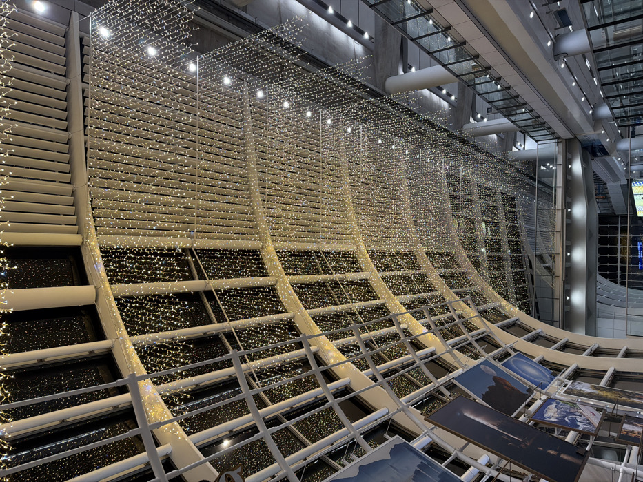 - "An interior scene features a high-ceilinged space adorned with strands of lights hanging down, creating a curtain-like effect" by FM-1neqH3, licensed under CC BY 4.0