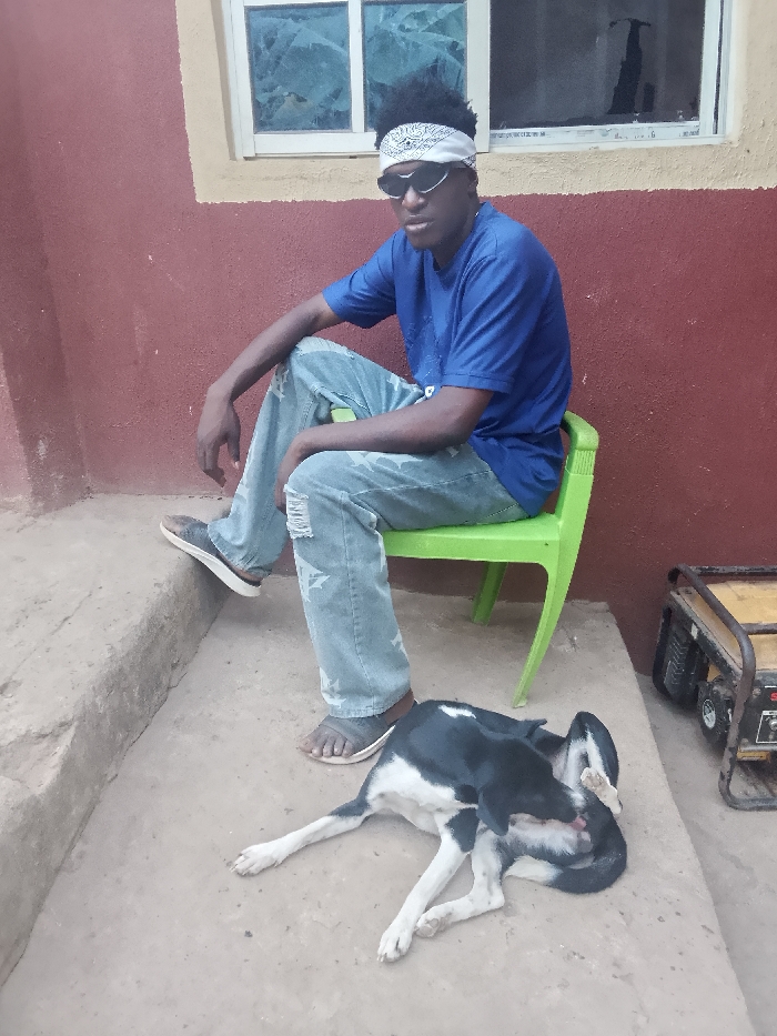 A person with a white bandana and sunglasses sits on a green plastic chair, wearing a blue shirt and patterned jeans with rips. The individual is sitting in front of a red wall next to a window. A black and white dog lies on the ground at the person's feet. A generator is next to the dog.