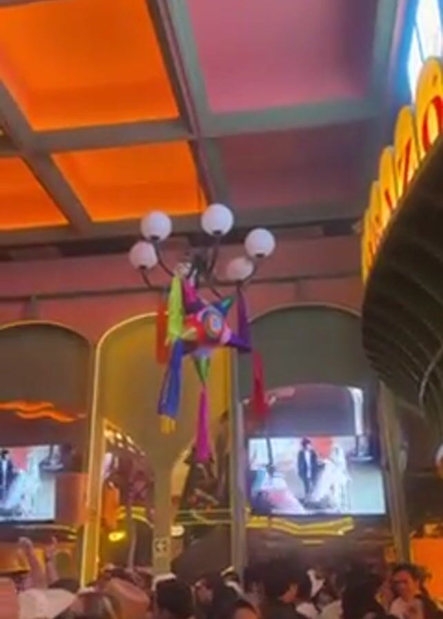 crowded bar or restaurant where a piñata hangs from a chandelier in the center of the room. The establishment has a colorful interior design with orange and pink accents. The space is filled with people, many of whom are wearing hats. Several TV screens are visible, displaying content. The crowd appears to be enjoying themselves.