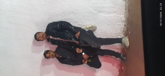 - "The image displays two adult males standing against a light-colored, textured wall in Al-Kiswa, Syria, captured at 22:35 on October 18, 2025" by FM-7hWgi1, licensed under CC BY 4.0