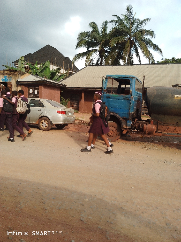 A group of students in school uniforms walk on a dirt road. Some wear backpacks. A silver car is parked behind them, alongside a building with a corrugated metal roof. A dilapidated blue truck with a tank is parked nearby. Palm trees rise in the background, with cloudy skies above. A building under construction is also visible. The ground is uneven and dusty.