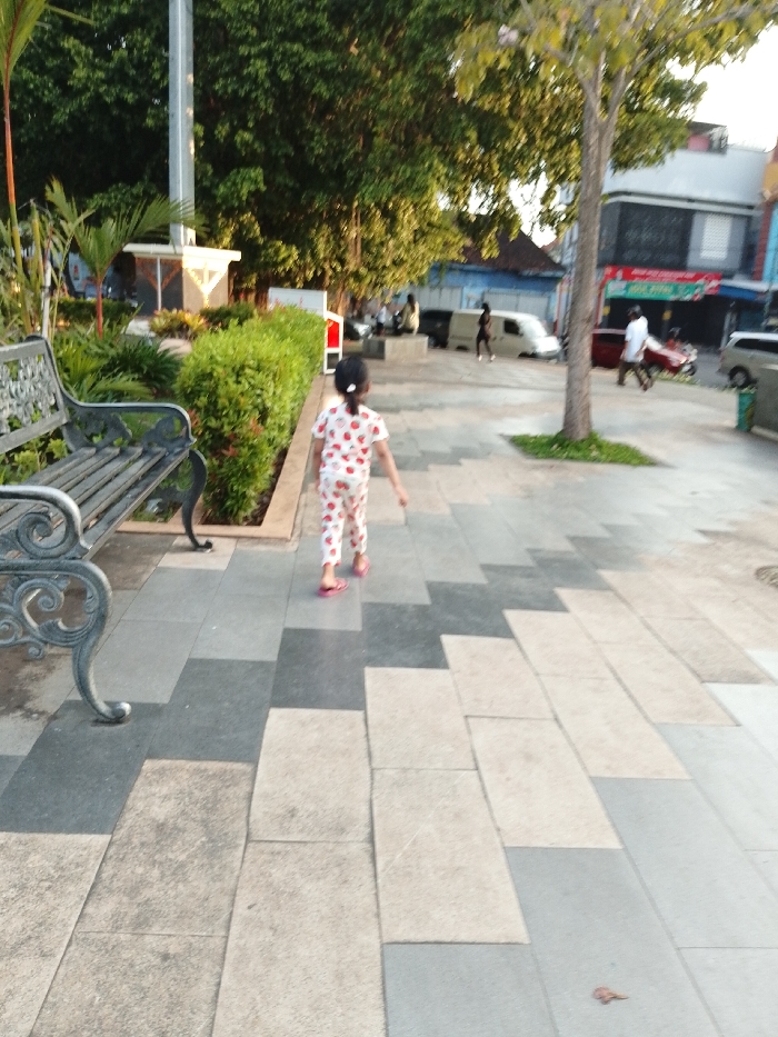 This image depicts an outdoor urban environment, likely a park or promenade, adjacent to a street in Kecamatan Pati, Indonesia, under clear daylight conditions with warm, possibly late afternoon or early morning, lighting. In the foreground, a decorative, dark-colored metal park bench is partially visible on the left. To its right, a meticulously trimmed row of green bushes forms a low hedge. A paved walkway, constructed from rectangular tiles in alternating shades of light grey and beige laid in a staggered pattern, occupies the central and right portions of the frame. A young child, appearing female and of toddler age, walks away from the camera in the midground. She wears a white two-piece outfit patterned with red strawberries and pink flip-flops. Her dark hair is pulled back in a ponytail. In the midground-to-background, a slender tree with green foliage stands to the right of the child. Further back on the left, a tall, light-colored monument or obelisk with a dark base is surrounded by dense green trees and foliage. On the right side of the background, a street is visible, populated by several vehicles including a white van, a dark SUV, and a red vehicle, along with multiple adult pedestrians. One individual in a white shirt is observed pushing a cart. Buildings with various architectural features and colors line the street. The sky above is clear.