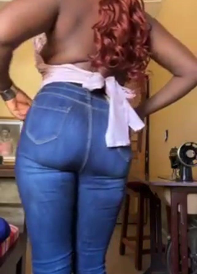 dark-skinned woman standing with her back to the camera. She's wearing dark blue jeans and a light pink top that ties in the back. Her hair is long and wavy, a reddish-brown color. In the background, there's a small wooden table with a framed picture on it, and another table with an old sewing machine on top. The walls are a light yellow color. The woman doesn't move much during the short clip.