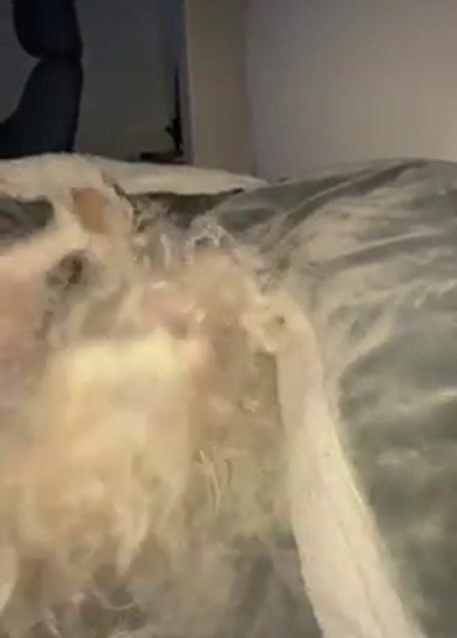 small, fluffy white dog lying on its back on a bed. The bed has a gray, textured blanket. The dog's belly is pink and visible through its fur. The dog rolls and wiggles on the bed. A dark office chair is visible in the background. The lighting is dim.