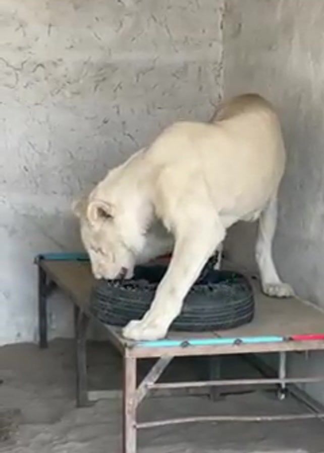 A white lion is eating from a black tire that is placed on top of a makeshift table in an enclosure