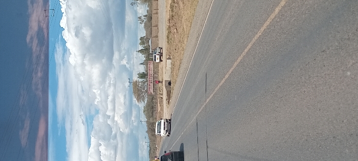 A road stretches towards the horizon under a partly cloudy sky. Parallel power lines extend into the distance on the left. A sign for "The Olive Restaurant Hotel" and parked vehicles are visible along the roadside. A white van travels along the road. The perspective is angled, with the road dominating the lower portion of the frame.