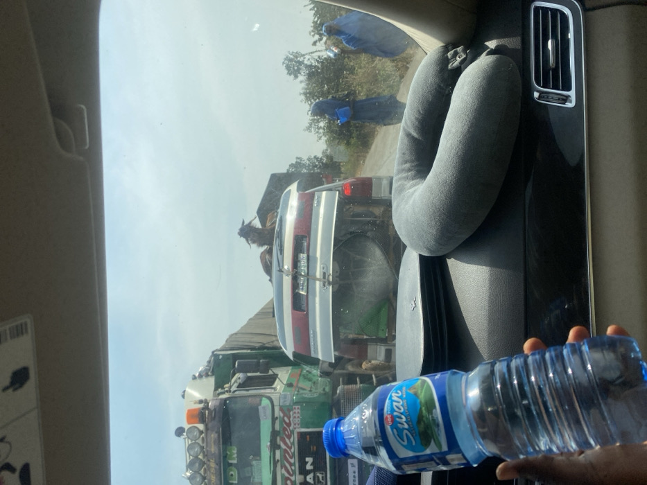 From the interior of a vehicle in Nandu, Nigeria, a clear, wide-angle view captures a stationary or slow-moving traffic scene under a bright, hazy sky. In the immediate foreground, a left hand holds a blue plastic bottle of "Swan" brand drinking water. To the right, a gray U-shaped travel neck pillow rests on the vehicle's dark dashboard, which also features a silver air vent. The midground features a line of vehicles. To the left, a large green and white "MAN" commercial truck with "DIESEL" and "DM" markings, multiple roof-mounted lights, and an orange beacon light is positioned. Directly ahead, a silver or light-colored SUV/minivan is visible. Its rear hatch is partially open, revealing a large circular object (possibly a basin or dish) and green fabric inside. A brown and white goat, with visible horns, is secured and standing on the roof rack of this SUV, facing forward. In the background, to the right of the road, sparse, dry vegetation and small trees line an unpaved shoulder. Three individuals, possibly women, are visible on the roadside. Two are prominently dressed in light blue, full-body garments; one carries a blue object. The third person is further in the background and less distinct. The overall environment suggests an outdoor, daylight setting with evidence of human and animal activity along a rural or semi-urban roadway.