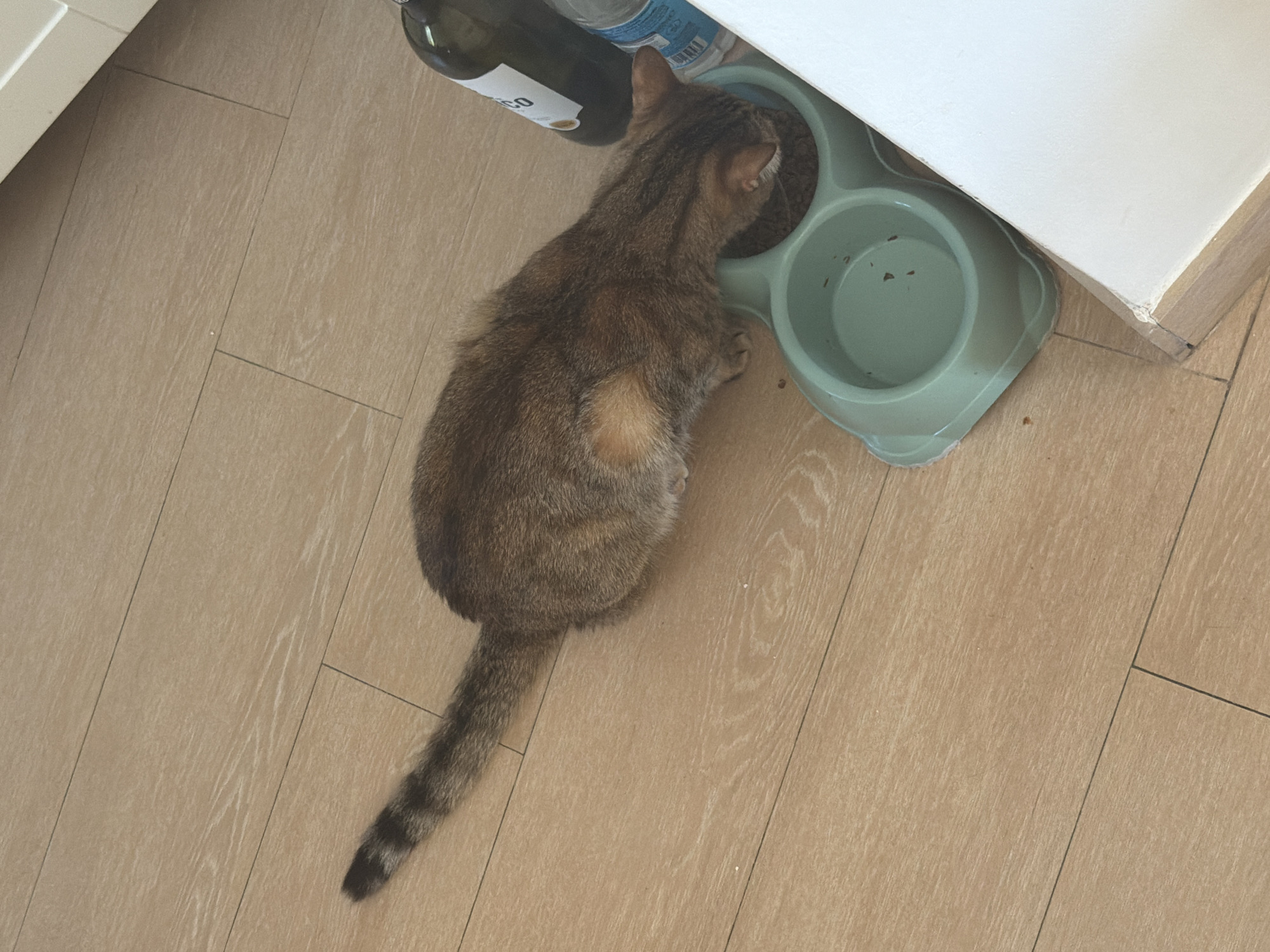 A domestic short-haired tabby cat, featuring brown and black stripes with occasional orange patches, is shown from an overhead perspective, crouched and actively consuming dry kibble from the left compartment of a light teal double pet bowl. The adjacent right compartment of the bowl is empty. The animal is positioned on a light-colored wooden plank floor, which exhibits scattered kibble fragments near the bowl. To the cat's right, a dark green glass bottle with a partially visible white label (showing "CO") stands beside a clear plastic bottle with a blue and white label. A white vertical surface, likely a wall or cabinet, with a light wooden baseboard, defines the right edge of the frame. The specific location within Milan, Italy, cannot be determined from the visual information provided.