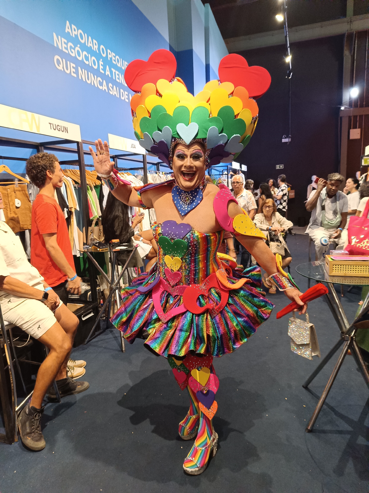 A person in a colorful, vibrant costume stands on a blue carpet. The costume consists of a rainbow-striped skirt, a heart-adorned bodice, and a large headdress of rainbow-colored hearts. They wear matching rainbow-striped stockings and shoes. The individual is smiling broadly and waving with their right hand, while holding a small, sparkling purse and a red object in their left hand. The background shows an indoor space with various people, including individuals seated at tables and browsing through clothing racks. Banners and signs are visible in the background, one with the text "APOIAR O PEQUENO NEGÓCIO É A TENTAÇÃO QUE NUNCA SAI DE". The scene appears to be taking place at an event or trade show, possibly in Rio De Janeiro, Brazil, based on the language on the banner.